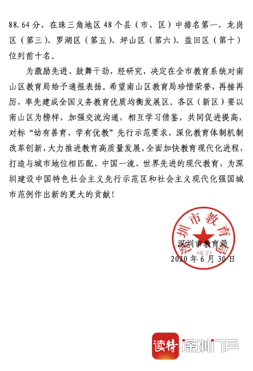 见圳客户端·深圳新闻网2020年7月1日讯(深圳特区报记者 李丽)6月30日,《深圳市教育局关于表扬南山区教育局的通报》在全市教育界引起关注。通报表示,近日,广东省人民政府教育督导室印发深圳市2018年度履行教育职责评价意见,深圳2018年度履行教育职责评价成绩为88.20分,在珠三角地区9个地级市中排名第一,其中,南山区成绩为88.64分,在珠三角地区48个县(市、区)中排名第一。经研究,决定在全市教育系统对南山区教育局给予通报表扬,并希望南山区教育局率先建成全国义务教育优质均衡发展区。