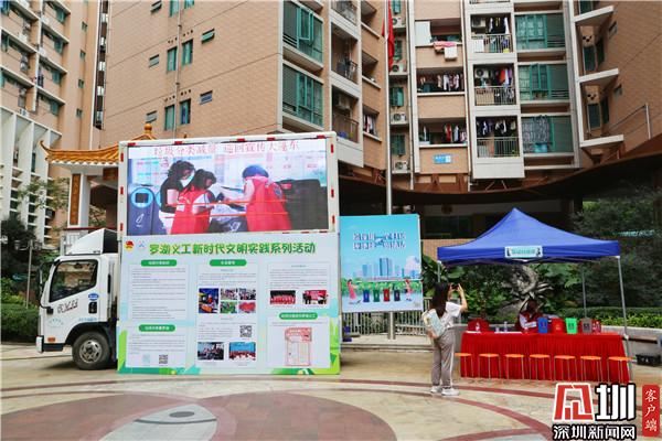 在渔民村文化广场,垃圾分类宣传车上的LED屏幕播放着垃圾分类减量宣传视频,供社区居民观看学习,据悉,这是全市首辆垃圾分类宣传大篷车。而此辆垃圾分类宣传车从渔民村发车也有着重要意义,上世纪70年代,渔民村趁着改革开放的春风,发掘地域的优势,做出了改革的第一步尝试,经过四十多年的发展,渔民村不仅夯实了物质基础,更是在精神文明层面上有了长足的发展,如今渔民村也成立了自己的志愿服务组织—深圳市罗湖区民乐志愿者协会。