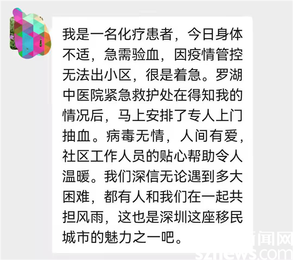 叶先生在护士为他抽血离开之后,送上了真挚地感谢。“无论我们遇到多大的苦难总会有人和我们一起共担风雨,这就是深圳的魅力”,叶先生说到。