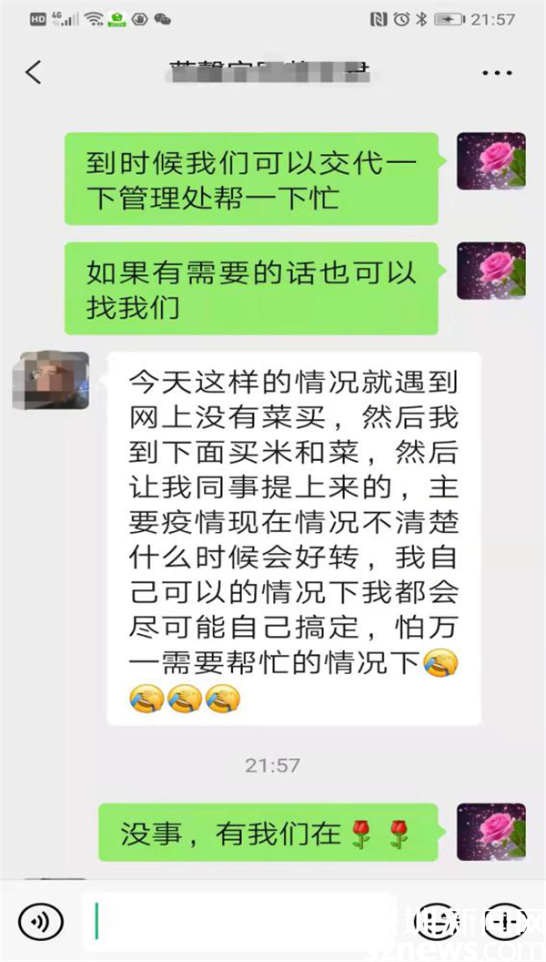 3月13日晚近十点,家住莲塘街道莲馨家园的黄女士通过微信向畔山社区党委副书记邹红梅求助,询问社区能否在自己待产不方便的情况下帮助购物送货……。原来,黄女士预产期在6月份,丈夫在部队服役,因为疫情原因,家中老人无法过来深圳照顾,只能自己在家休养,心理压力较大顾虑较多。了解到情况后,邹红梅耐心疏导黄女士焦虑和恐慌情绪,说明社区的关爱措施,并微信回复说,“需要帮忙,可以找我们。放心吧,有我们在。”
