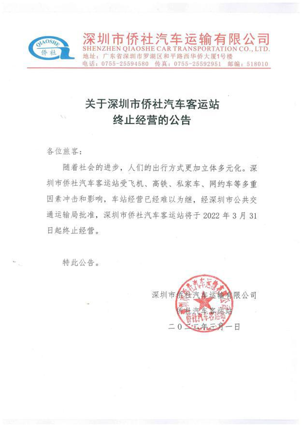 近日,记者从深圳市交通运输局罗湖管理局获悉,自2022年3月31日起,深圳市侨社汽车客运站终止经营,这个营业了31年的“老牌”汽车客运站,正式宣布退休。