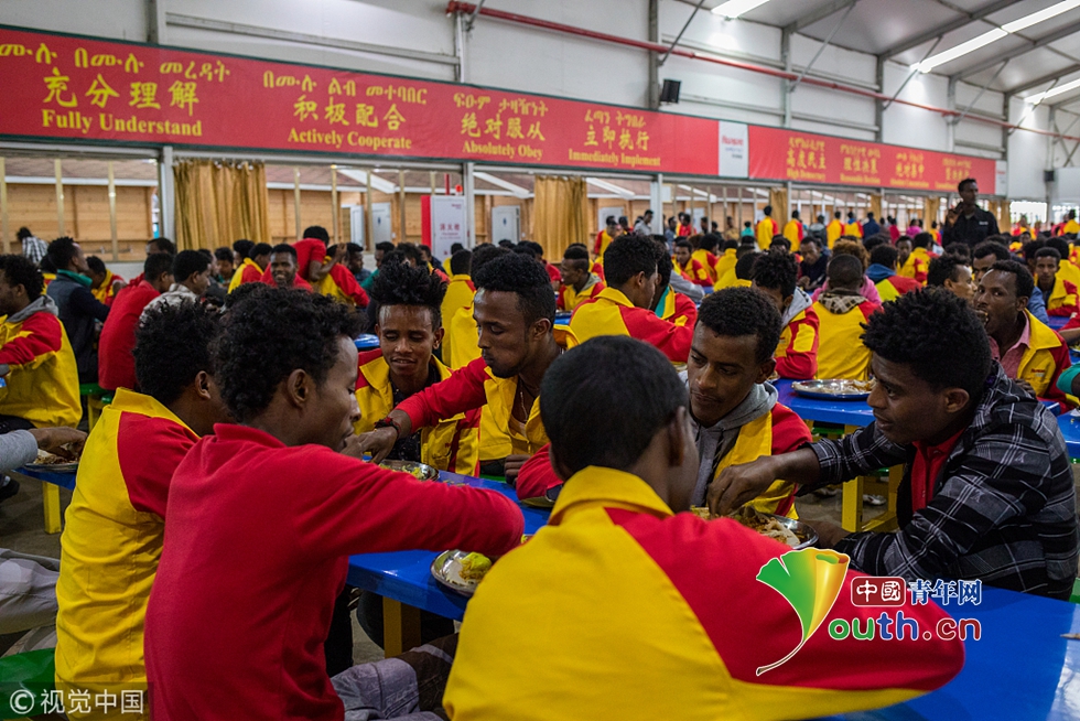 工人在食堂吃午餐,吃的是当地的特色主食英吉拉。