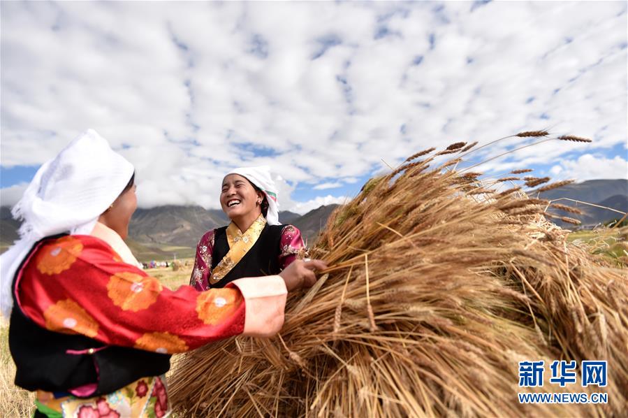 9月23日,首个中国农民丰收节,拉萨市林周县松盘乡松盘村两名藏族农民在田间聊天。 新华社记者 觉果 摄