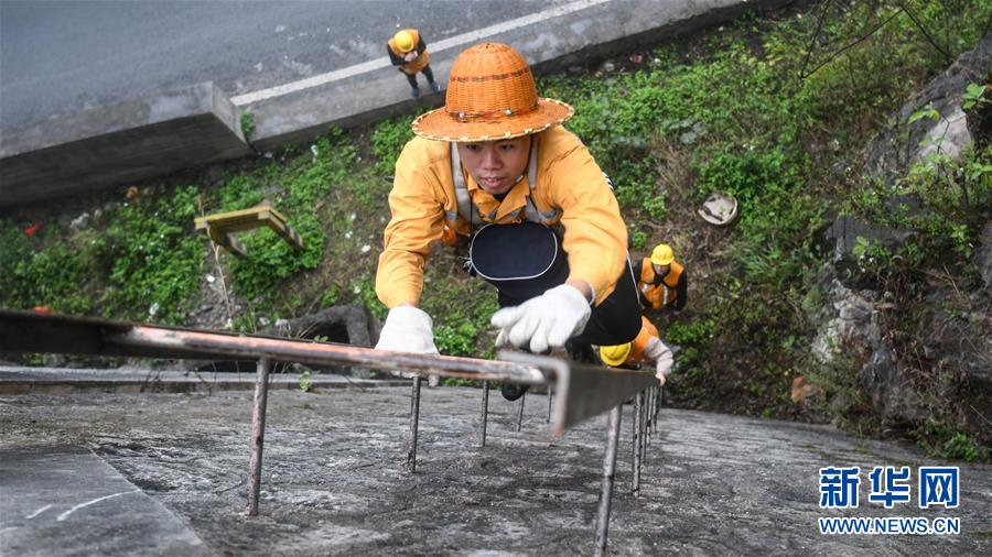 1月14日,百色工务段白水河桥隧工区班组成员攀梯上山开展巡查工作。在中国铁路南宁局集团公司百色工务段白水河桥隧工区,有一个由14名工人组成的班组。他们常年像“爬山虎”一样行走攀爬在地形险峻、云雾缭绕的高山上,负责南昆铁路辖区路段的搜山扫石工作,清除一切可能危害铁路行车安全的因素,保障旅客出行安全。新华社记者张爱林摄