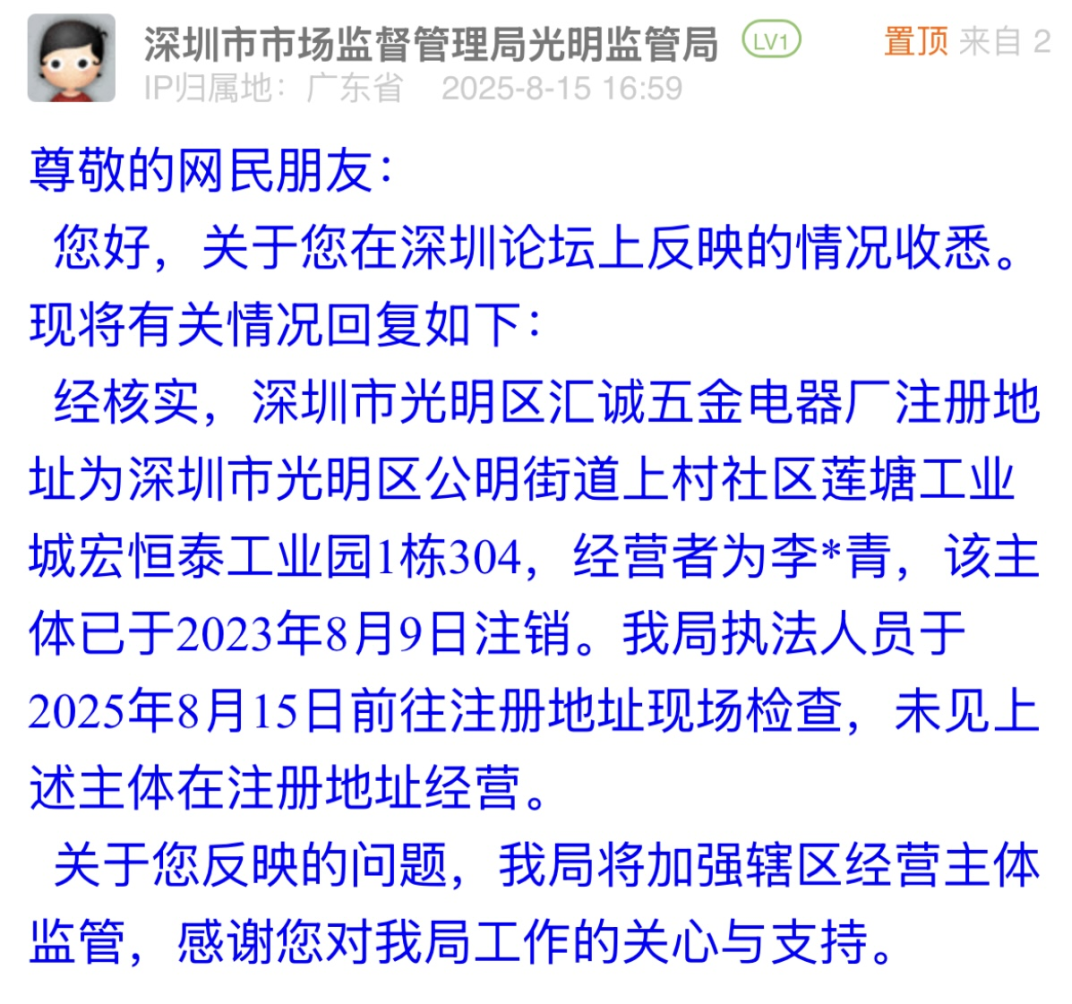 优化建议:深圳市市场监督管理局光明管理局的回应中,核实了涉事电器厂已注销,且不在注册地经营,也提及加强辖区主体监管,但市民反映的排插套用注销主体信息销售、违规标识3C标志等关键问题,未得到明确解答。若回应中能丰富指引类内容,如告知市民可向平台追责的途径、提交证据的具体方式,为市民维权提供清晰方向,将更贴合市民需求,也能让回应更具实际意义。
