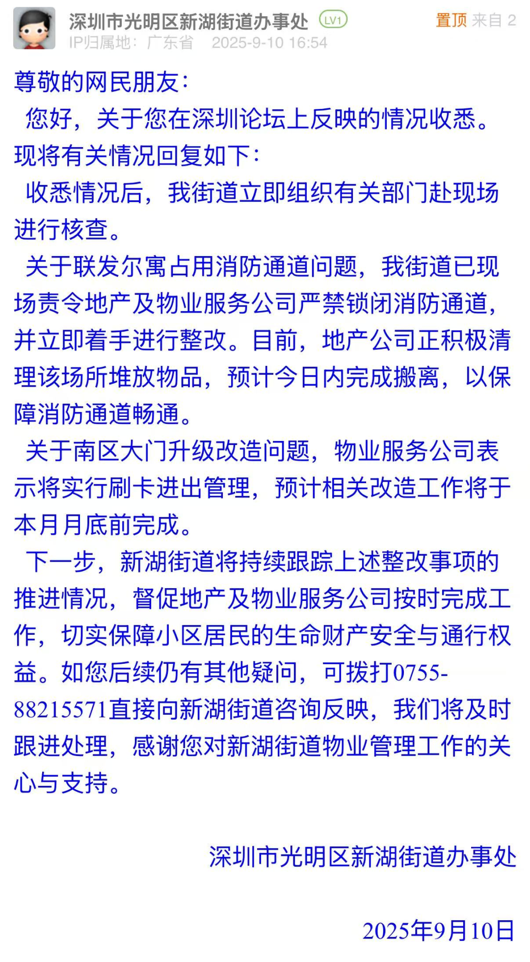 案例点评:消防通道是保障居民生命安全的“生命通道”,在突发状况下肩负着关键作用。针对小区消防通道被违规占用这一安全隐患,新湖街道办第一时间责令责任方整改,高效推动障碍物清理,畅通消防通道。对于市民小区大门升级改造的诉求,街道办的回应明确了刷卡管理改造的时间节点,以实际行动推动安全隐患消除、提升小区管理品质,充分彰显了基层治理的责任担当与务实智慧。