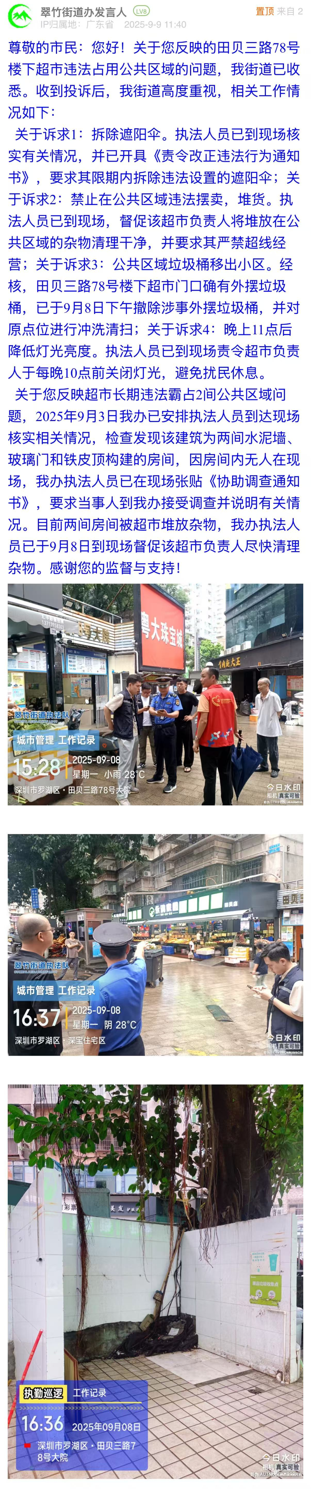 案例点评:本案例中,翠竹街道办立足市民诉求,对违规搭建遮阳伞、占用公共区域、违规堆放垃圾、店面灯牌亮度过高这四个问题,街道均做到快速响应,并以图片展示治理效果。回应既体现了基层执法的规范性与时效性,又展现了对民生细节的关注力,践行了“小事不小办、事事有回音”的理念,为同类民生诉求的解决提供了可借鉴范式。