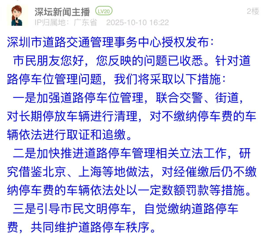 优化建议:市民在帖文中反映,其此前的投诉件被标记为“办结”,但霸位车辆依旧未被移走,现场问题未解决,质疑相关部门执行力不足。对于市民的再次投诉,深圳市道路交通管理事务中心的回应存在公式化、未切实回应市民核心关切的问题,仅以“加强管理”“推进立法”“引导文明停车”等回复,难以消除公众对治理执行力的疑虑。建议后续强化回应针对性,具体问题具体答复,如公开执法流程、提供处置证据等,以务实态度回应市民监督,提升治理公信力。