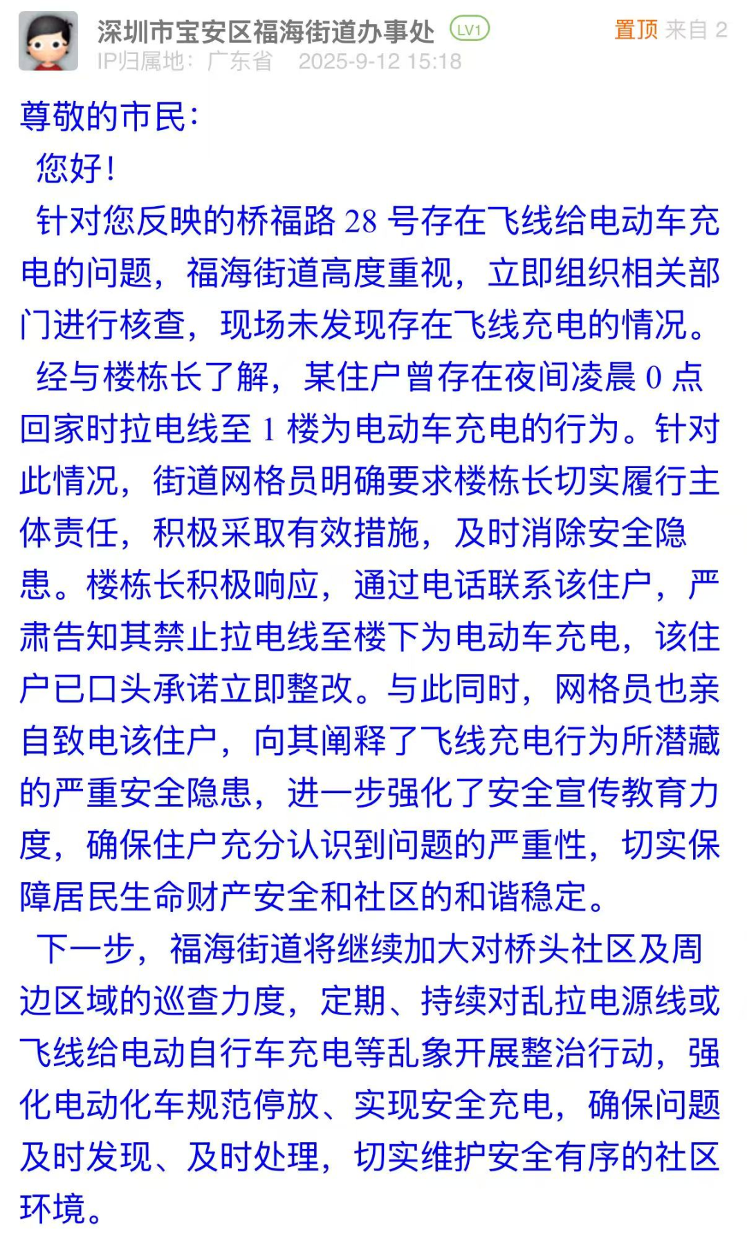 案例点评:福海街道办对电动车“飞线充电”问题展现出快速响应、权责明晰的治理态度,第一时间组织核查,既明确主体责任、严令整改,又细致开展安全教育,让住户充分认知“飞线充电”的严重危害,体现执法和普法的双重担当。回应中,街道办还表示将强化巡查力度、开展整治行动,建立长效治理机制,维护社区安全秩序,彰显了基层治理中“问题导向、标本兼治”的治理逻辑。