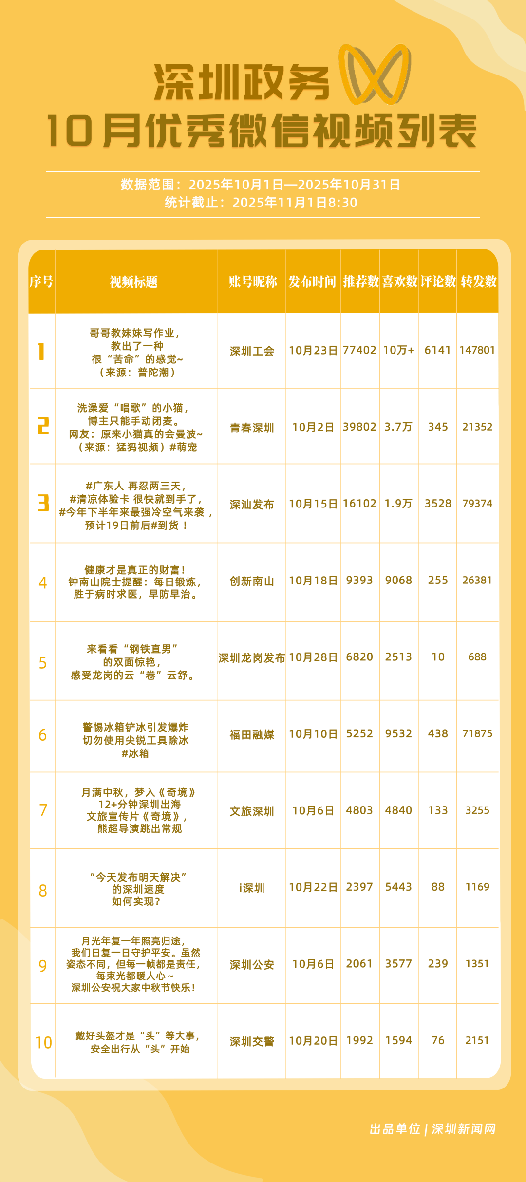 10月,“深圳工会”“深汕发布”“创新南山”“深圳龙岗发布”“青春深圳”“福田融媒”“深圳龙华”“滨海宝安”“深圳光明”“深圳天气”上榜“优秀政务微信视频号”。其中,“深圳工会”一条有关教写作业教出“命苦感”的视频吸引大量网民关注,获得超10万次喜欢,助推其位列榜单第一名;“深汕发布”积极传播降温、台风等民生信息,以99.91分位列榜单第二名;“创新南山”和“深圳龙岗发布”得分在95分左右,内容突出区域成绩与创新活力,实现了政务服务与传播效果的双赢。上榜账号不断强化区域动态与民生服务的传播,在政务新媒体赛道形成示范效应。