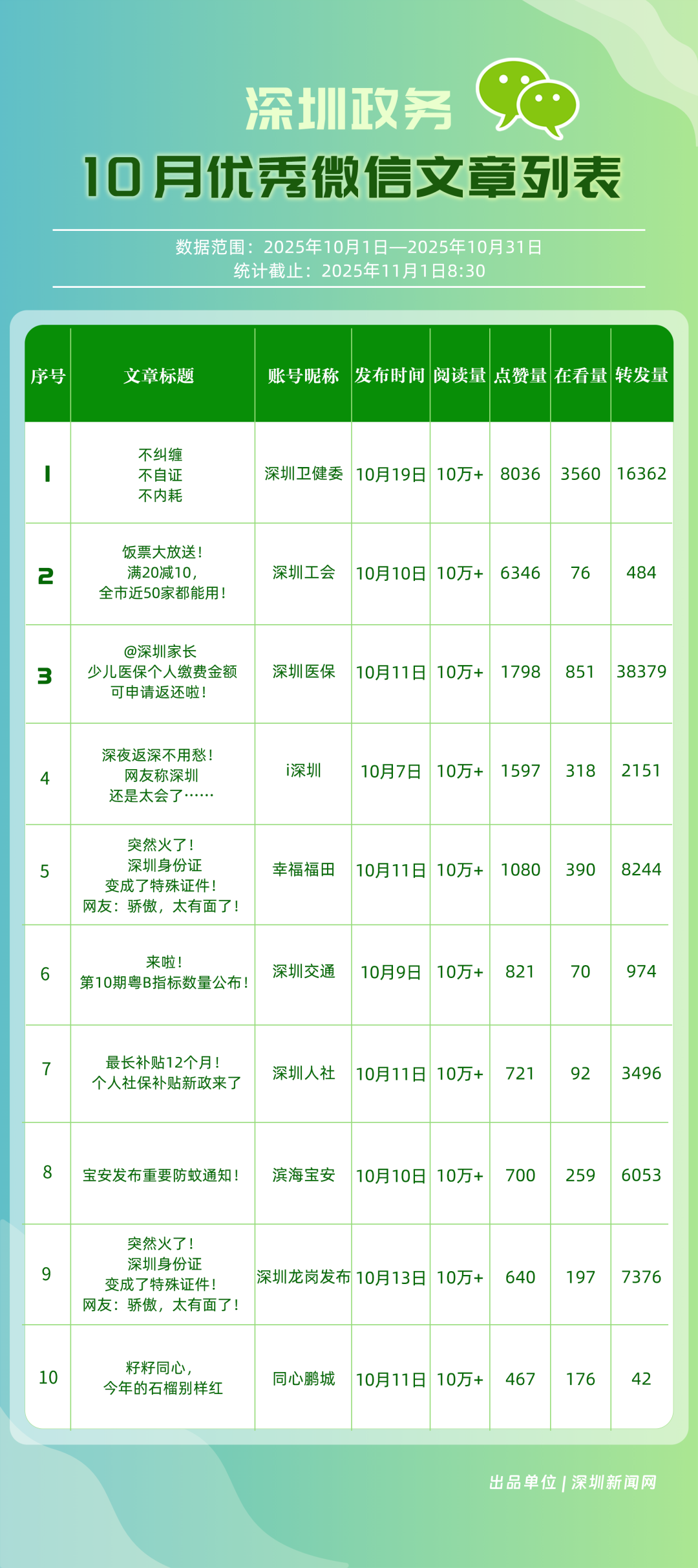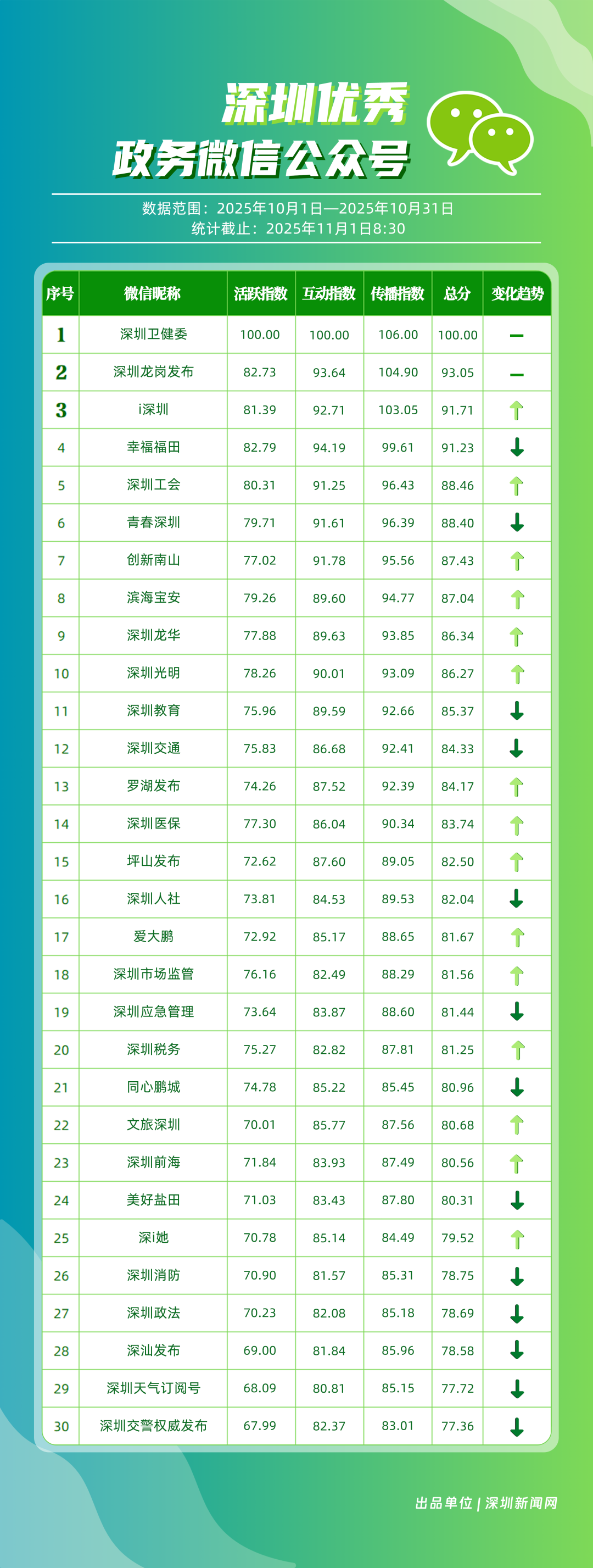 10月,“深圳卫健委”“深圳龙岗发布”“i深圳”“幸福福田”“深圳工会”“青春深圳”“创新南山”“滨海宝安”“深圳龙华”“深圳光明”等30个政务微信公众号荣登“深圳优秀政务微信公众号”榜单。10月,“深圳卫健委”以总分100位居榜首,其持续以真诚、反套路的内容,将专业健康知识转化为网民喜闻乐见的“生活指南”,受到大量网民喜爱;“深圳龙岗发布”位居第二,持续发布高质量内容,成为市民获取龙岗动态的“第一窗口”;“i深圳”也发布政策、民生内容,排名有所上升,位列第三;“幸福福田”“深圳工会”等也立足区域特色,通过多元内容,展现各自的发展活力。