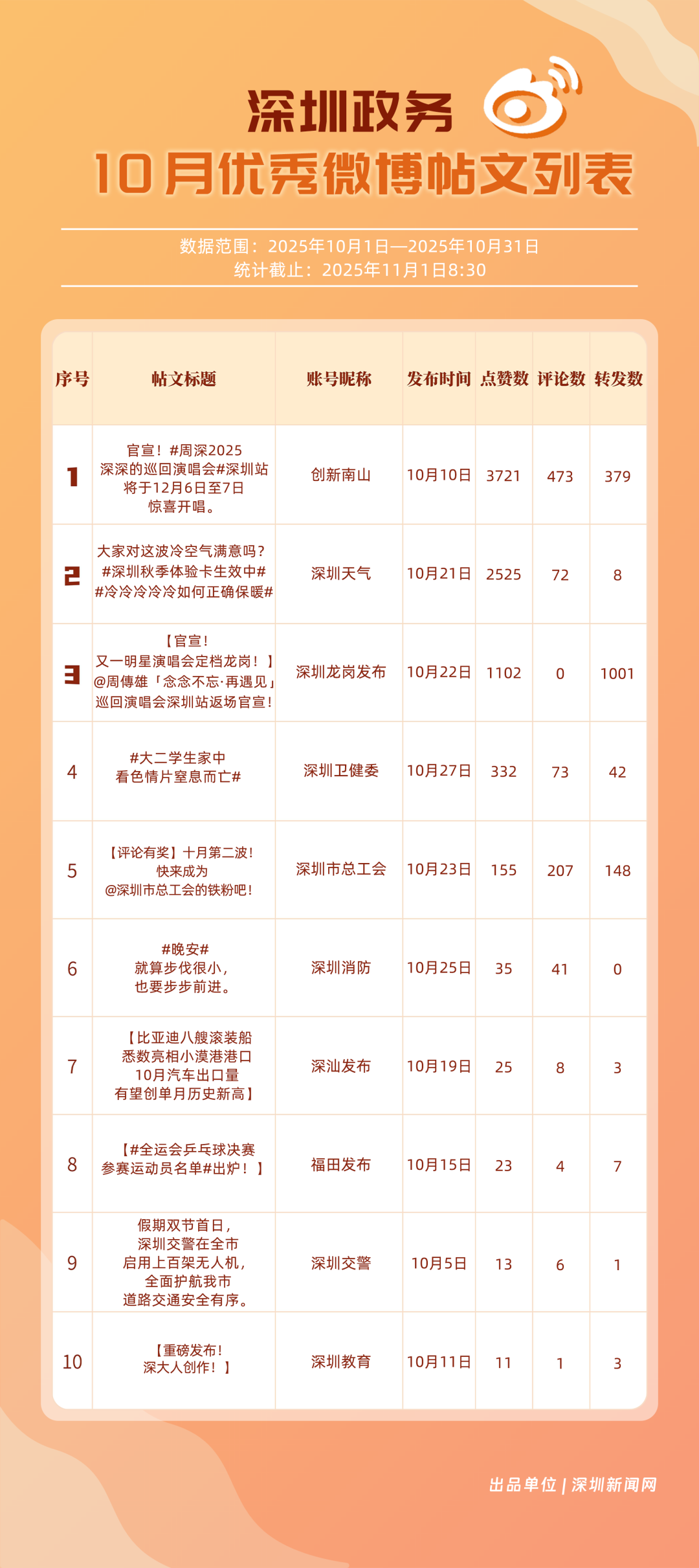 10月,20个账号入选“优秀政务微博号”榜单,其中包括:“深圳天气”“深圳龙岗发布”“深圳市总工会”“深圳消防”“创新南山”“福田发布”“深圳卫健委”“深汕发布”“深圳应急管理”“深圳公安”等。其中,“深圳天气”高频、及时地发布天气相关内容,其中多篇关于“冷空气”“入秋”帖文收获较好互动和传播效果,以100分位列榜单首位;“深圳龙岗发布”总分97.37分,居于榜单第二,其有关演唱会定档、卷尺哥等内容的帖文获得较好数据;“深圳市总工会”关注职工日常生活,以97.03分居于榜单第三。“深圳消防”“创新南山”等微博账号也通过各自的特色内容,展现深圳城市治理、民生服务的温度。